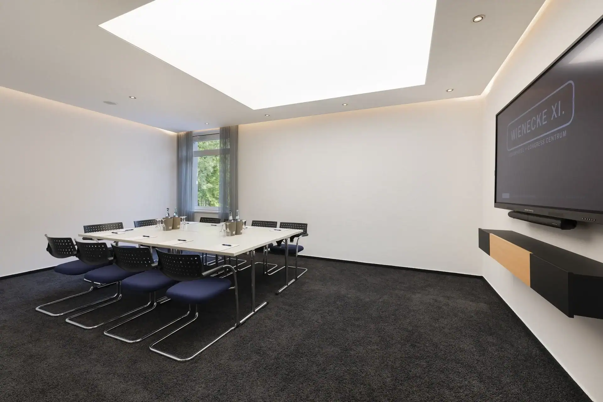 Conference room VI - perspective conference table to wall display. Conference table with 10 cantilever chairs, display on front wall, flipchart, drinks fridge, indirect ceiling lighting, skylight