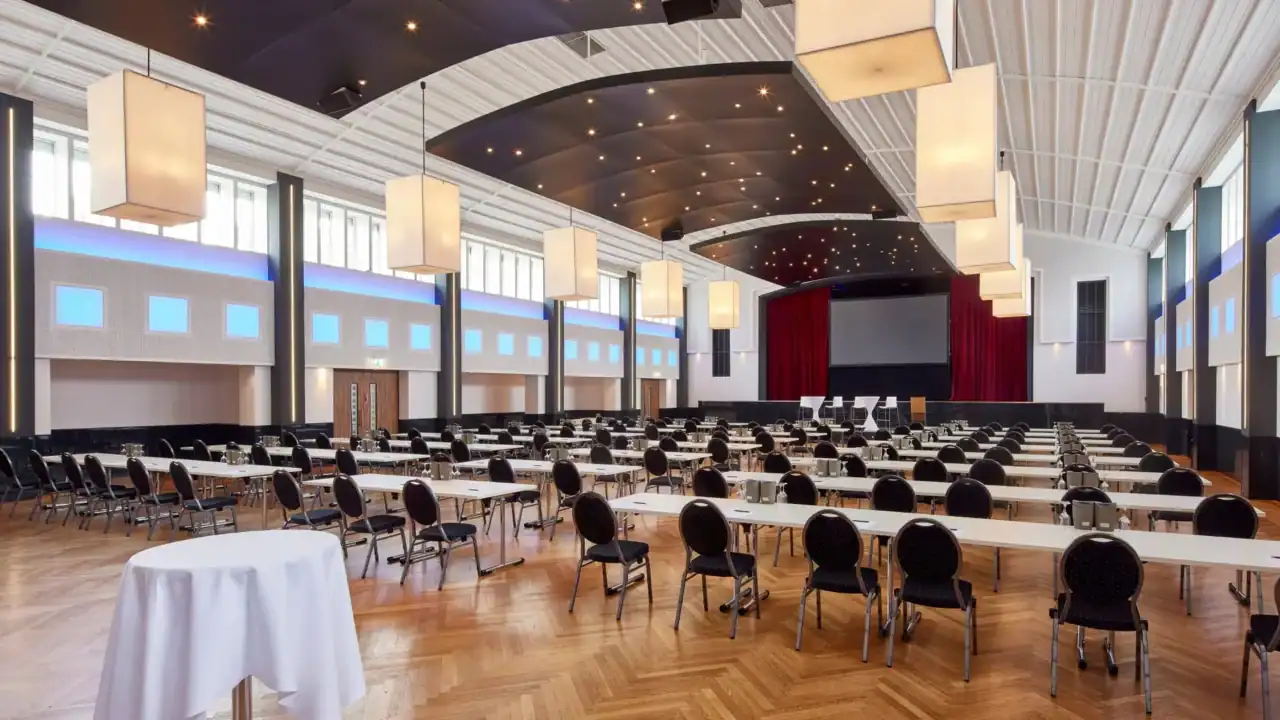 Modernste Technik für individuelle Anforderungen: Der Saal ist mit neuester Veranstaltungstechnik ausgestattet und lässt sich flexibel an Ihre Wünsche anpassen – von Licht- und Tonanlagen über audiovisuelle Systeme bis hin zu digitalen Lösungen für hybride Events. So wird jede Veranstaltung zu einem technisch perfekt inszenierten Erlebnis.