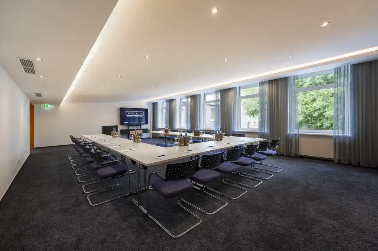 Tagungsraum VII – Diagonale Perspektive. U-Form Bestuhlung mit Konferenztischen und 24 Freischwingern, Rednerpult, mobiles Display, Fensterfront (5 Fenster), indirekte Deckenbeleuchtung, Teppichboden