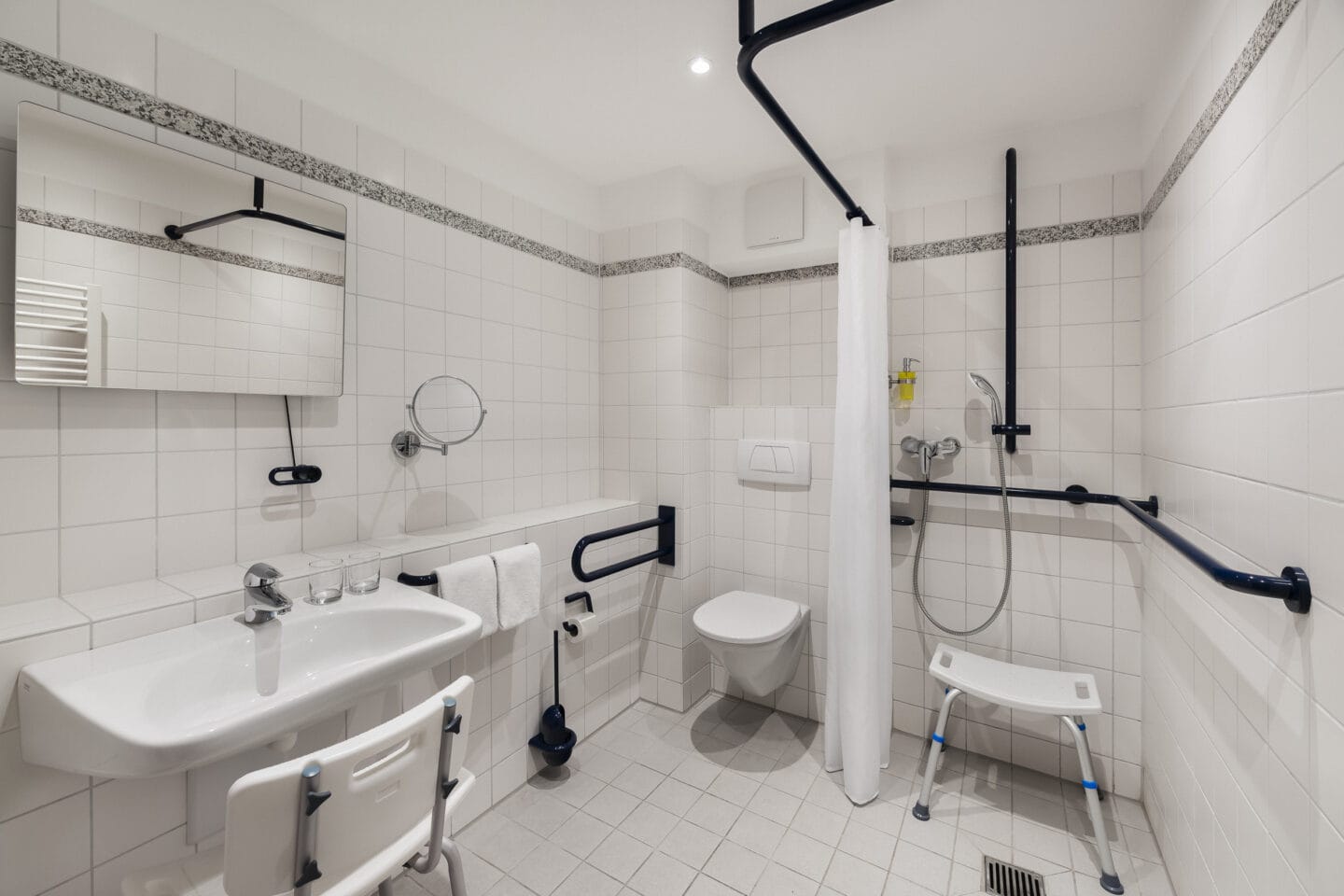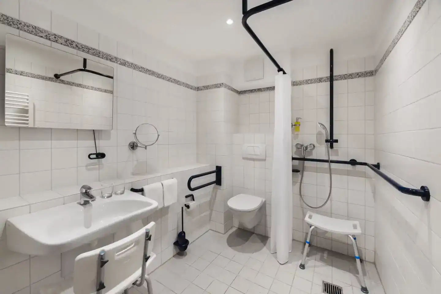 Rollstuhlgerecht ausgestattet, mit breiten Türen und ebenerdiger Dusche – für einen entspannten Aufenthalt ohne Kompromisse. Das Schlafsofa ermöglicht Begleitpersonen, direkt im Zimmer zu übernachten.